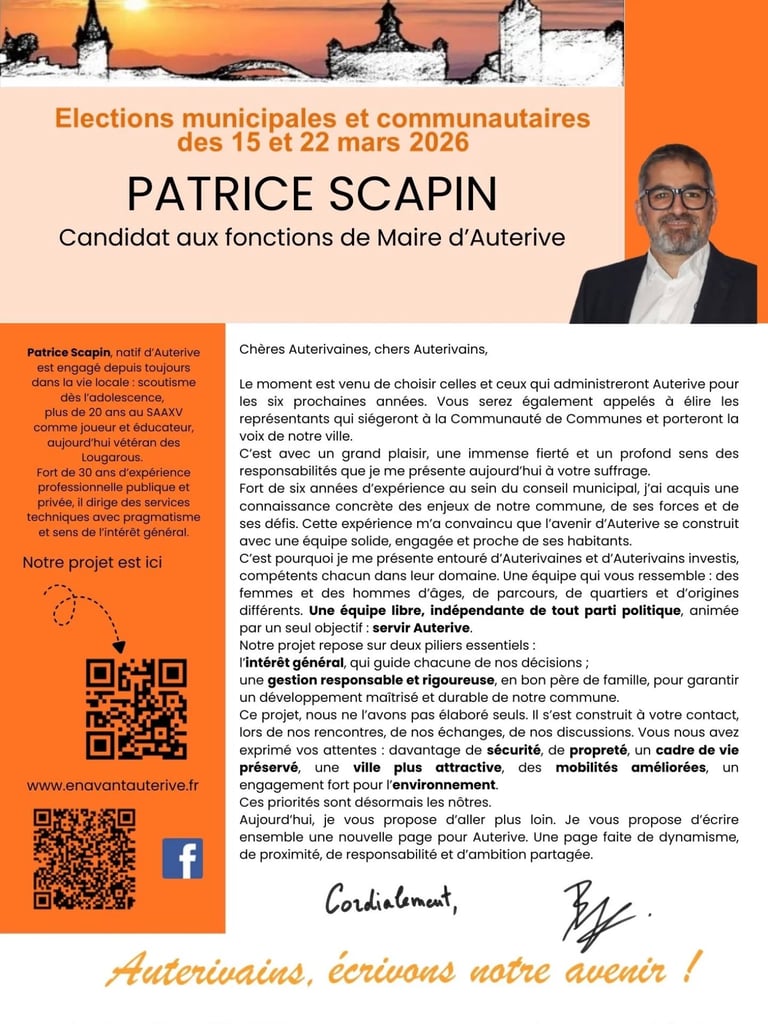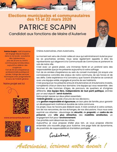 À la suite des élections municipales de 2020, Patrice SCAPIN et Didier GALLET ont été élus dans les rangs de la minorité. Depuis, ils proposent un point de vue différent de l'équipe majoritaire et se sont entourés d'Auterivains pour partager leurs propositions et construire une équipe pour les prochaines élections municipales.