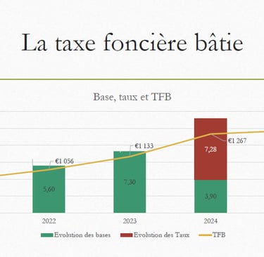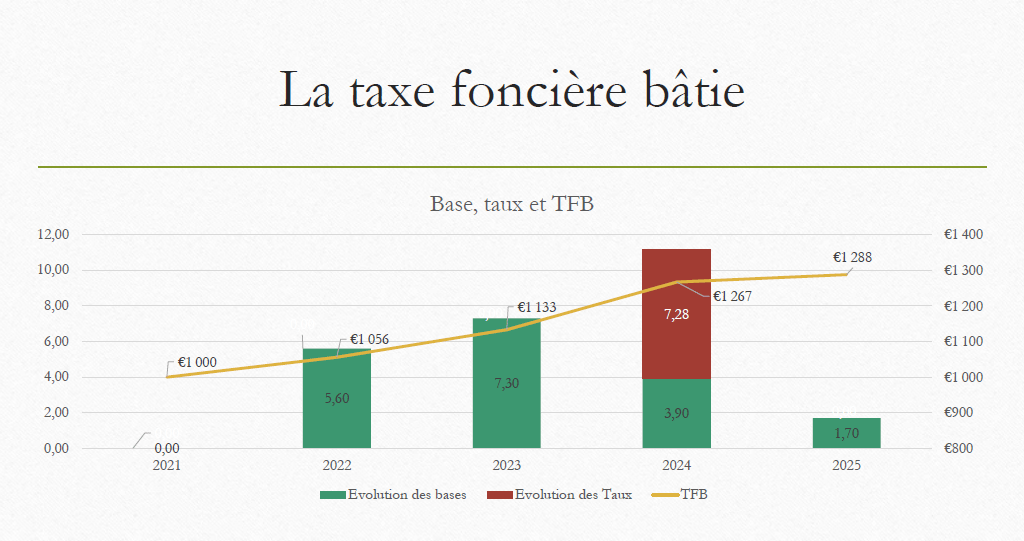 Ce graphique illustre l'évolution de la taxe foncière bâtie (TFB) entre 2021 et 2025, en détaillant : L'évolution des bases (barres vertes) L'évolution des taux (barres rouges) Le montant total de TFB en euros (courbe jaune) En résumé : La TFB a donc augmenté régulièrement de 2021 à 2024, notamment en 2024 avec une forte hausse due à l’augmentation des taux (+7,28 %) par le Maire et des bases (+3,90 %) par l'Etat malgré un engagement du maire de ne pas augmenter les taux pendant son mandat. En 2025, la hausse est plus modérée.