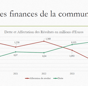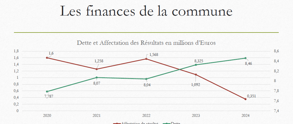 Ce graphique montre l’évolution de la dette et de l’affectation des résultats de la commune entre 2020 et 2024 (en millions d’euros). En résumé : La dette (ligne verte) augmente progressivement, passant de 7,79 M€ en 2020 à 8,46 M€ en 2024. L’affectation des résultats (ligne rouge) diminue fortement sur la période, passant de 1,6 M€ en 2020 à seulement 0,351 M€ en 2024. Cela reflète une situation où l’endettement s'accroît tandis que la capacité à dégager un excédent se réduit.