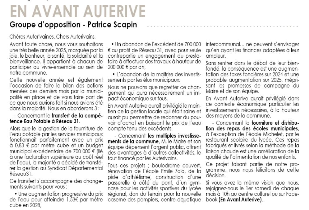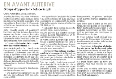 Dans cette expression libre, nous évoquons le transfert de la compétence "Eau Potable", les investissements colossaux et la cuisine à liaison chaude pour la rentrée 2025